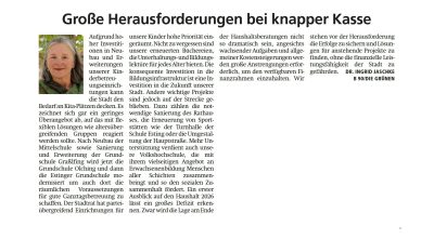 Über große Herausforderungen angesichts begrenzter finanzieller Möglichkeiten schreibt unsere Fraktionsvorsitzende und 3. Bürgermeisterin Dr. Ingrid Jaschke im aktuellen Mitteilungsblatt der Stadt Olching.